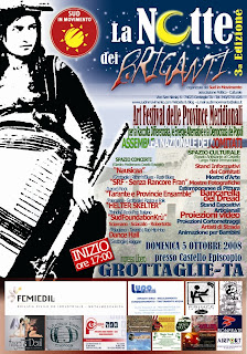 Domenica 5 ottobre 2008 a Grottaglie (TA) presso il Castello Episcopio e Largo immacolata si svolgerà la terza edizione della manifestazione politico culturale “La Notte dei Briganti” organizzata dall’associazione grottagliese “Sud in Movimento”.Quest’anno, il tema sarà “la raccolta differenziata, le energie alternative e la democrazia dei popoli”, argomenti che in continuità con le edizioni precedenti, mettono in evidenza la tragica situazione ambientale e democratica che affligge il meridione d’Italia, in particolare Taranto e la sua provincia.Evidentemente, lo stato delle cose spinge i cittadini ad occuparsi in prima persona del territorio e delle sue problematiche, infatti, proprio in questo anno Grottaglie è teatro di una forte mobilitazione popolare e pacifica, che vuole discutere e promuovere risposte alternative a quelle che stanno portando alla distruzione del pianeta e all’aumento dei tumori sul nostro territorio.Proprio per questo non si poteva che scegliere questa cittadina, come palco naturale per rappresentare l’incapacità delle attuali amministrazioni, locali e non, da destra e sinistra, a risolvere le problematiche ambientali e democratiche dei propri cittadini.Tale manifestazione, è ormai un appuntamento fisso ed attesissimo da quanti vogliono partecipare ad un evento culturale in cui ci si può confrontare e informare sulle tematiche proposte, infatti alle 17:00 si darà il via all’evento con una assemblea a cui parteciperanno comitati e associazioni, locali e nazionali; poi al termine dell’ assemblea ci sarà l’inizio dei concerti, che faranno da cornice agli interventi dal palco delle associazioni e comitati che vi parteciperanno.Inoltre questa manifestazione prevede al suo interno l’Art Festival delle Province Meridionali ed i gruppi musicali che si esibiranno saranno: i Nausicaa (Rithm’n’Blues – Rock Blues), i Senzarancorefran (Rock), i Tarantae & Province Ensamble (Pizzica e Folk), gli Helter Skelter (Rock-Pop Italiano), i Sud Foundation Krù (Hip hop – Rap); vi sarà poi la rappresentazione teatrale della “Compagnia Pagine Verticali“ di Roberta Fiordiponti, Adriano Calzolaro, Daniela Colapinto, in più ci saranno stand informativi ed espositivi, una singolare estemporanea di pittura realizzata da artisti locali, proiezioni, mostre di pittura e intrattenimento per bambini.L’associazione organizzatrice “Sud in movimento” distribuirà dei pieghevoli contenti informazioni sulla raccolta differenziata e le energie alternative, che ovviamente vuole essere il primo vero input informativo su tali tematiche, atteso che a Grottaglie, ma in tutta la regione, le amministrazioni non mettono in atto una vera e propria politica per la raccolta differenziata, lasciando credere ai cittadini che la vera soluzione ai rifiuti è l’inceneritore o la discarica, contravvenendo a quanto stabilito dalla direttiva europea.