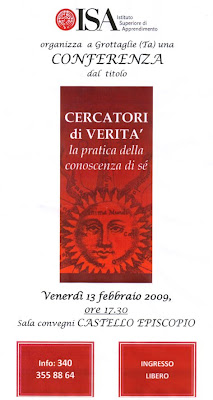 Venerdì 13 febbraio 2009, alle ore 17.30, presso la sala conferenza del Castello Episcopio di Grottaglie (Ta), si terrà una conferenza dal titolo CERCATORI DI VERITA’, la pratica della conoscenza di sé, organizzata dall’Associazione Istituto Superiore di Apprendimento (ISA) – Puglia.